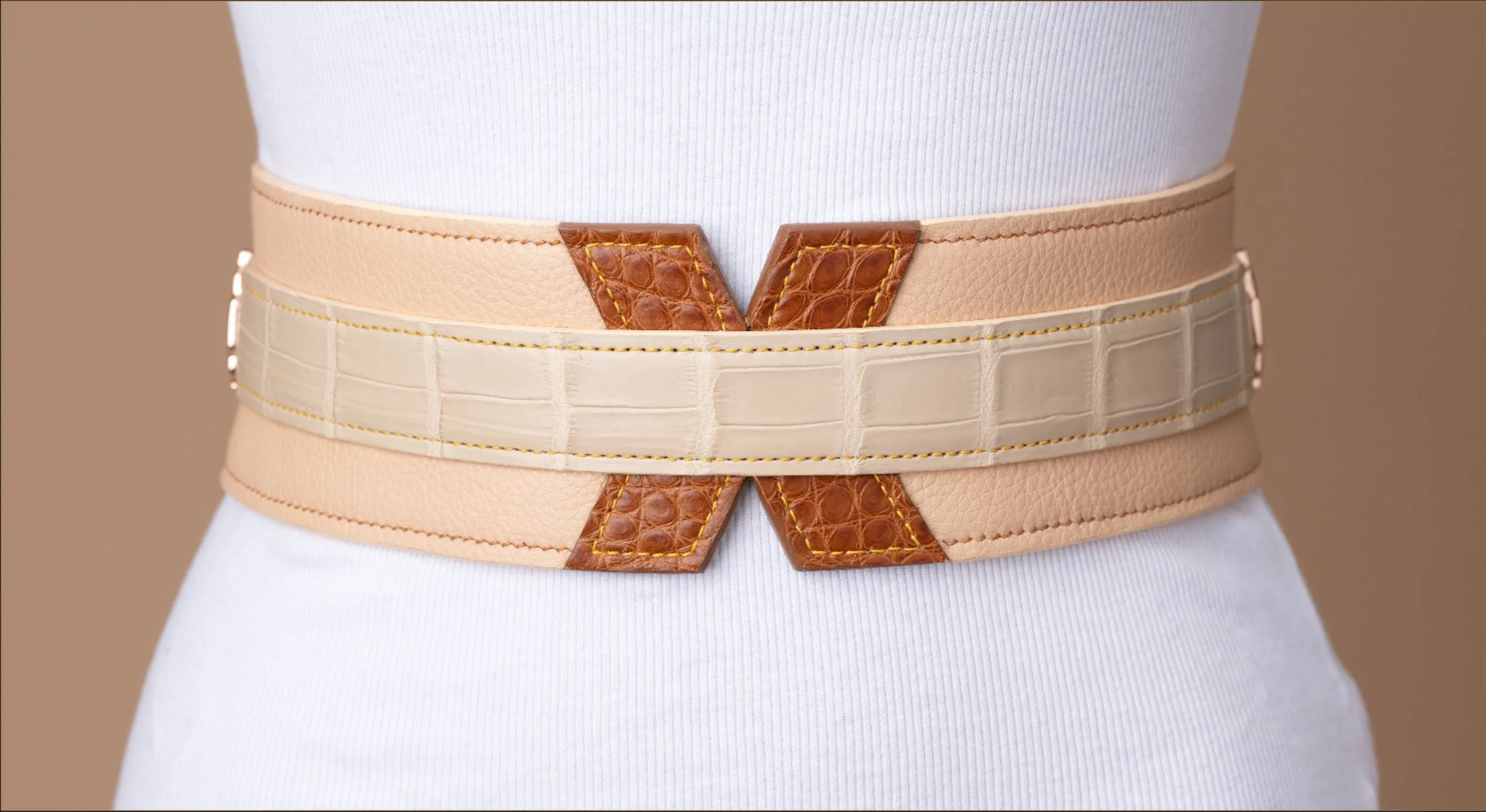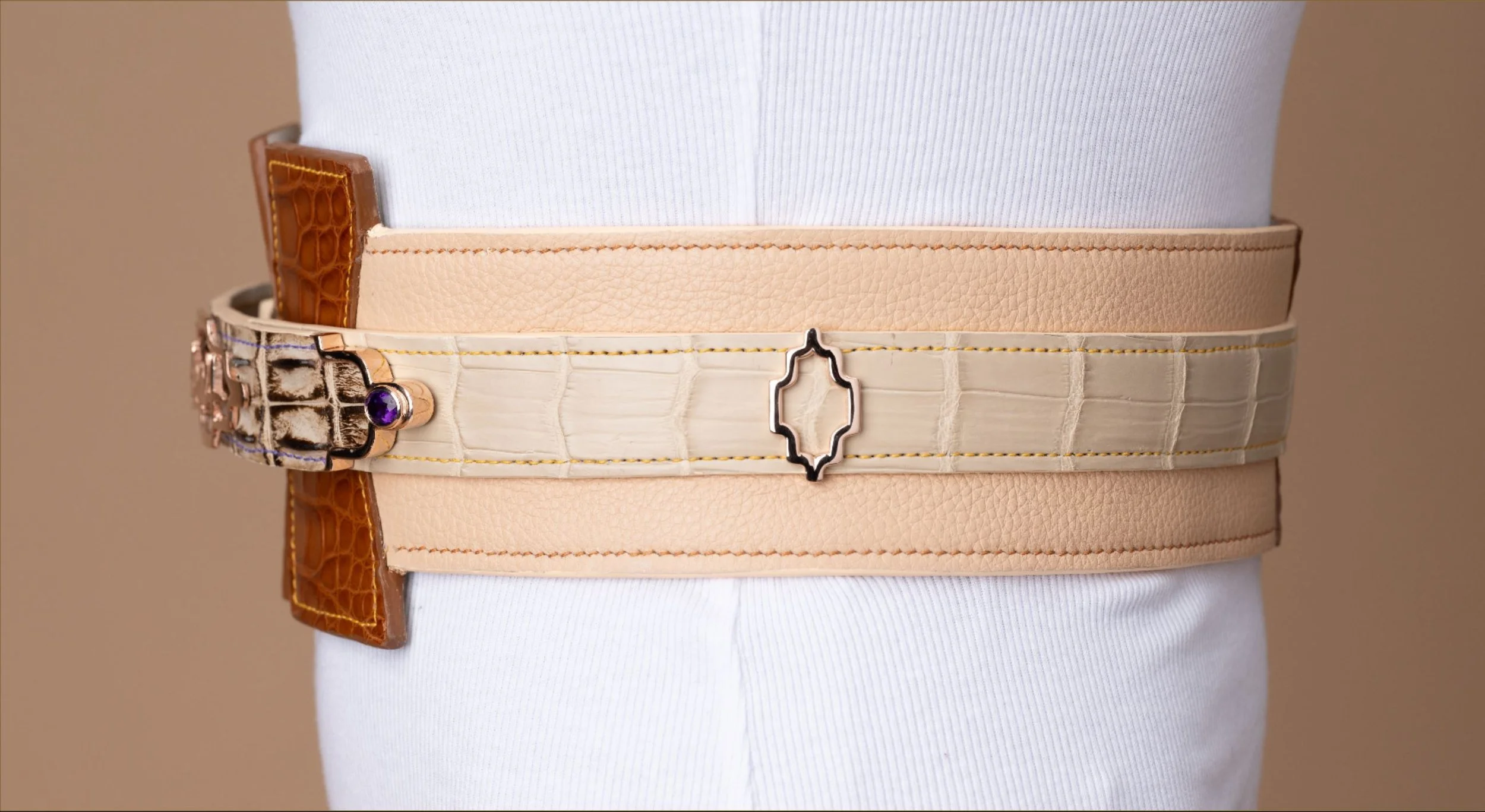 The leather belt is made with Italian calf, Amercian alligator and Hornback salt water corocodile.